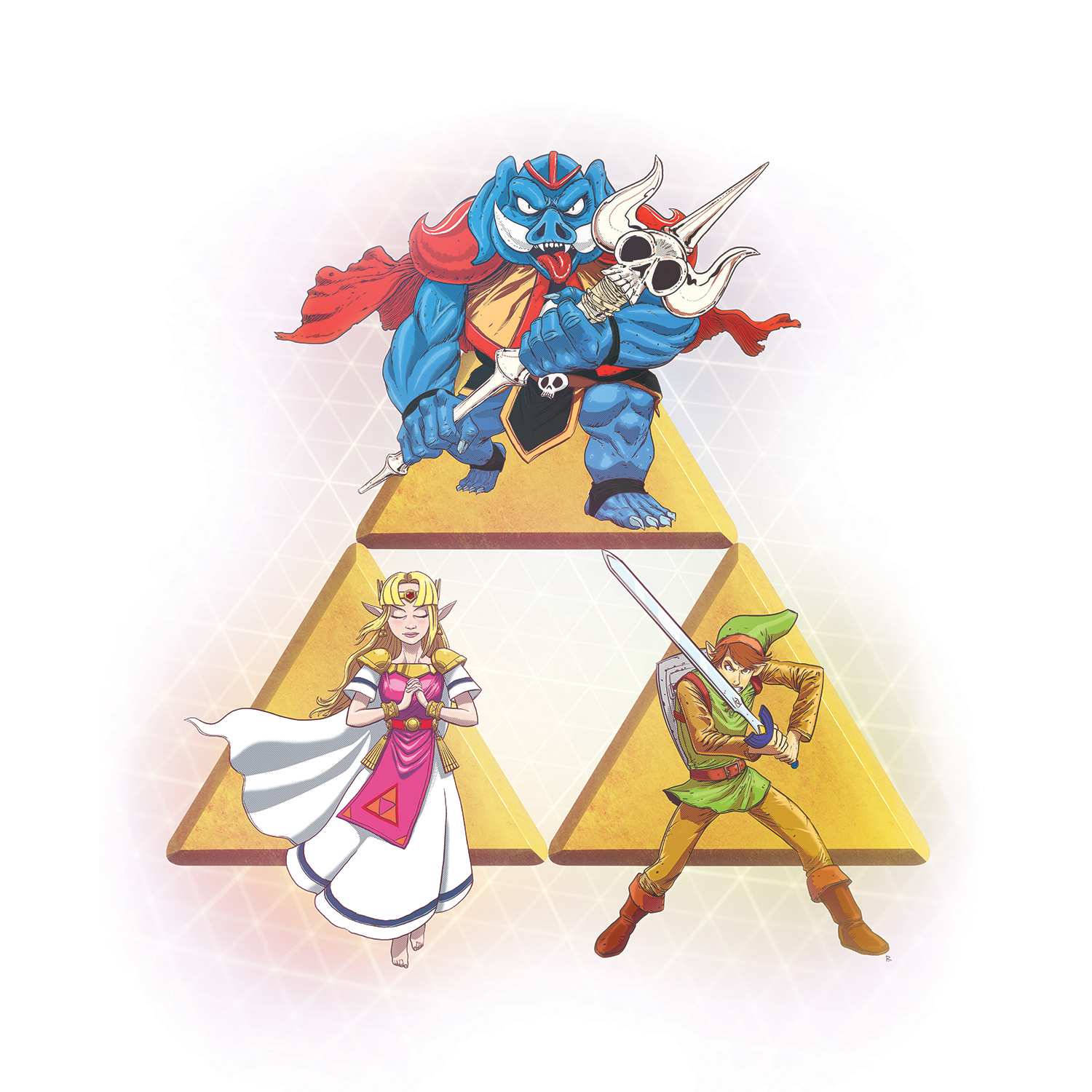 A fan art tribute of the triforce! Inspired by the early concept art for NES and SNES games, The Legend of Zelda! Now available as stickers and soon as prints! http://rodrigoshop.storenvy.com/